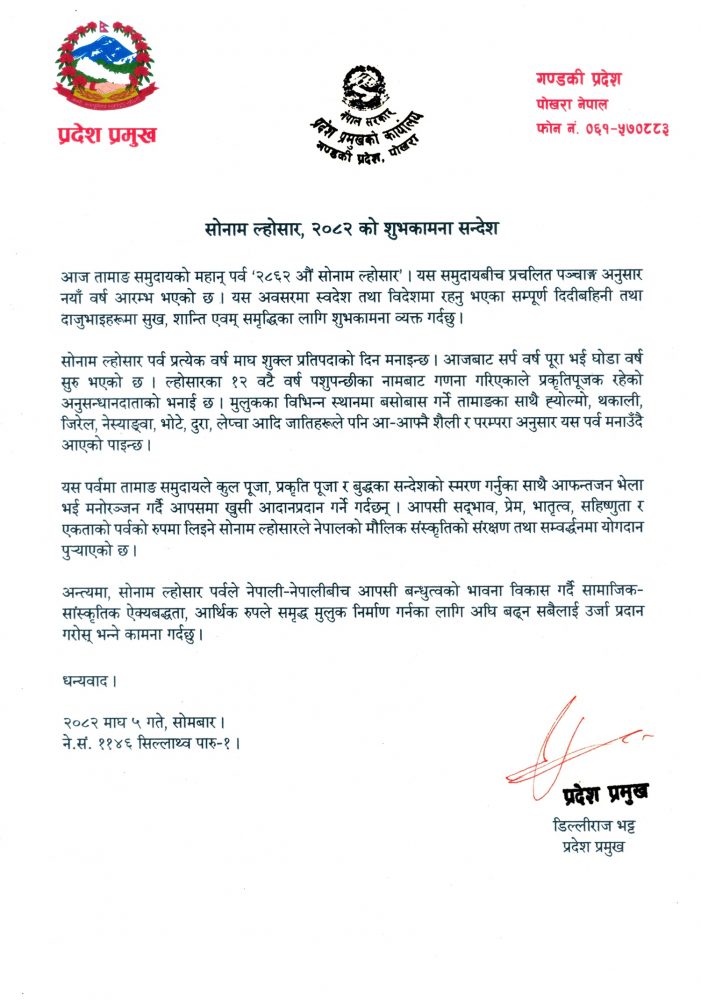 पोखरा, ५ माघ । गण्डकी प्रदेशका प्रमुख डिल्लीराज भट्टले तामाङ समुदायको महान् पर्व ‘२८६२ औं सोनाम ल्होसार’ का अवसरमा शुभकामना प्रदान गर्नुभएको छ ।