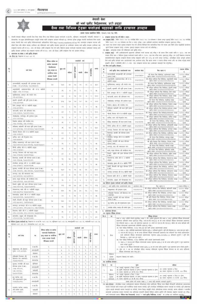 उपत्यका पृतना नारायणहिटीका लागि ३५० जना, काभ्रेको भकुण्डेबेसीस्थित २६ नम्बर बाहिनी अड्डाका लागि ७५ जना, भक्तपुरको सूर्यविनायकस्थित रणशेर गणका लागि एक सय जना, सुनसरीको इटहरीस्थित पूर्वी पृतना हेडक्वार्टरका लागि दुई जनालगायत विभिन्न गणमा विभिन्न सङ्ख्यामा सैन्य पदमा नयाँ भर्ना लिन लागेको हो ।