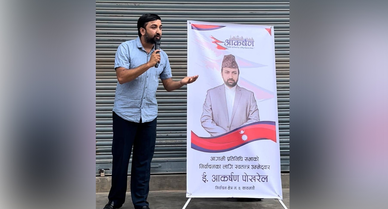 यसै क्रममा काठमाडौं क्षेत्र नम्वर– ४ मा युवा इन्जिनियर आकर्षण पोखरेलले संघीय निर्वाचनका लागि स्वतन्त्र उम्मेदवारीको घोषणा गरेका छन् । आज यस क्षेत्रको कपनमा आयोजित एक कार्यक्रमका बीच पोखरेलले प्रतिनिधिसभा सदस्यमा स्वतन्त्र उम्मेदवार बन्ने घोषणा गरेका हुन् । सो क्रममा पोखरेलले आफूसँग विकासको एजेण्डा रहेको भन्दै कसैलाई गाली गरेर नेता बन्न नचाहेको बताए ।