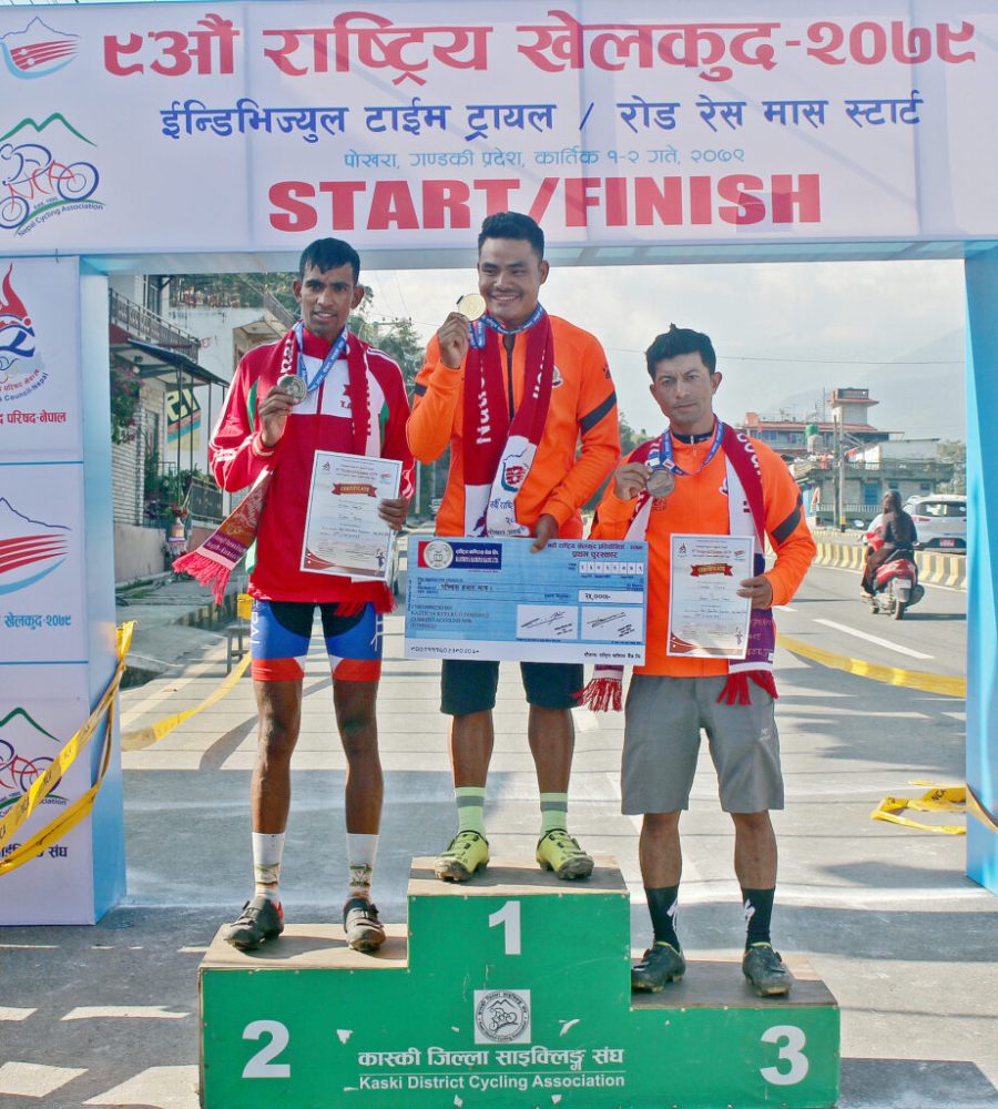 आजै भएको पुरुषतर्फको इन्डिभिज्युल टाइम ट्रयाल साइक्लिङमा एपीएफले स्वर्ण र कास्य तथा नेपाल आर्मीले रजत पदक जितेका छन् । २० किलोमिटरको दुरी ३४ मिनेट ०४ सेकेण्ड ३०९ मिलिसेकेण्डमा पुरा गर्दै एपीएफका सुरज रानामगरले स्वर्ण पदक जितेका हुन् ।