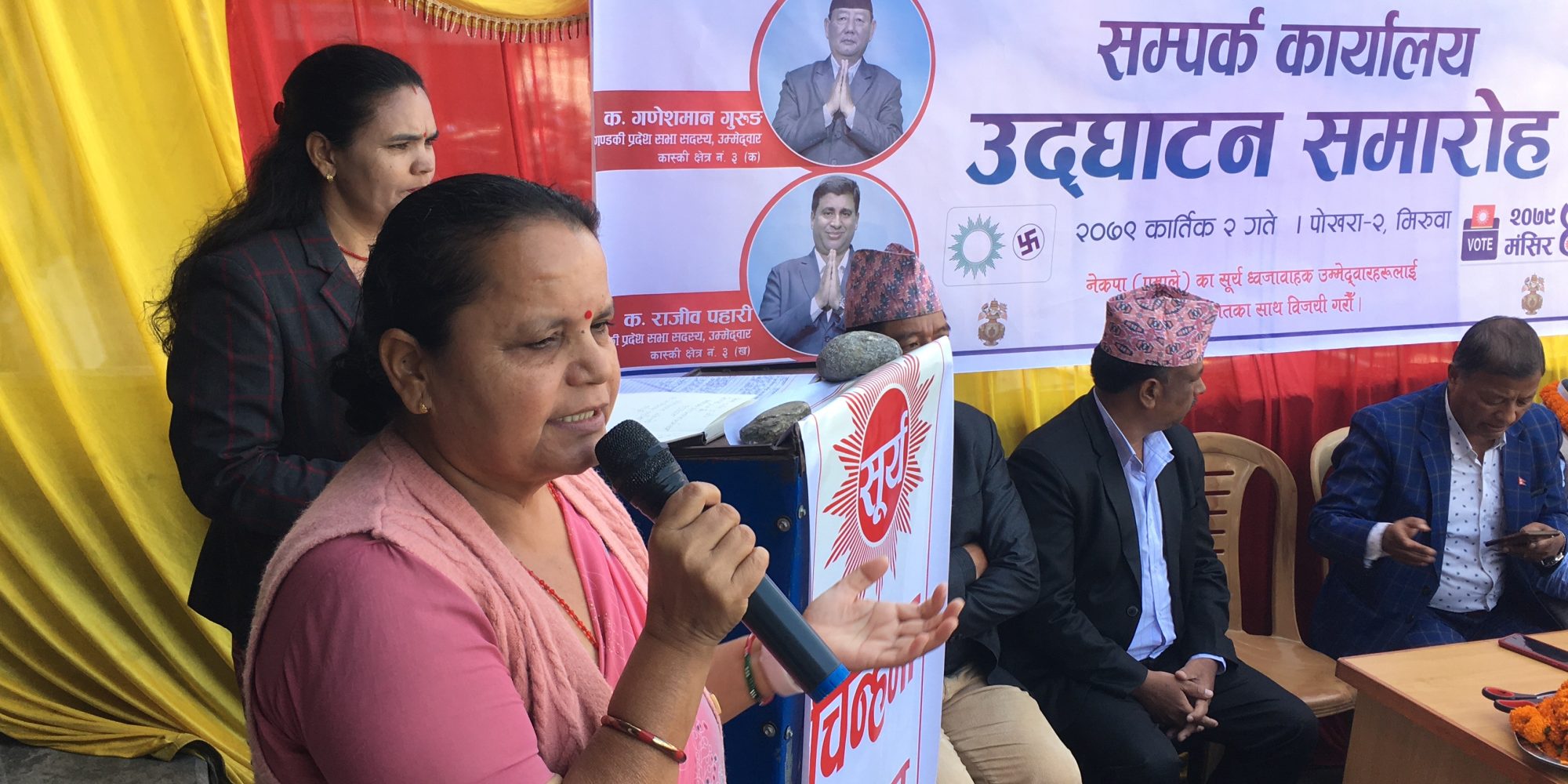 कार्यालयको उद्घाटन गर्दै नेकपा एमालेका पोलिव्युरो सदस्य एवं पुर्व खेलकुदमन्त्री जगत विश्वकर्माले नेपालको सिङ्गो राष्ट्र निर्माण र विकासको अभियानमा लाग्ने पाटी एमाले भएकोले मङसिर ४ गते हुने निर्वाचनमा सुर्य ध्वजावाहाक उम्मेदवारहरूलाई जिताउनुपर्ने जोड दिनुभएको छ ।