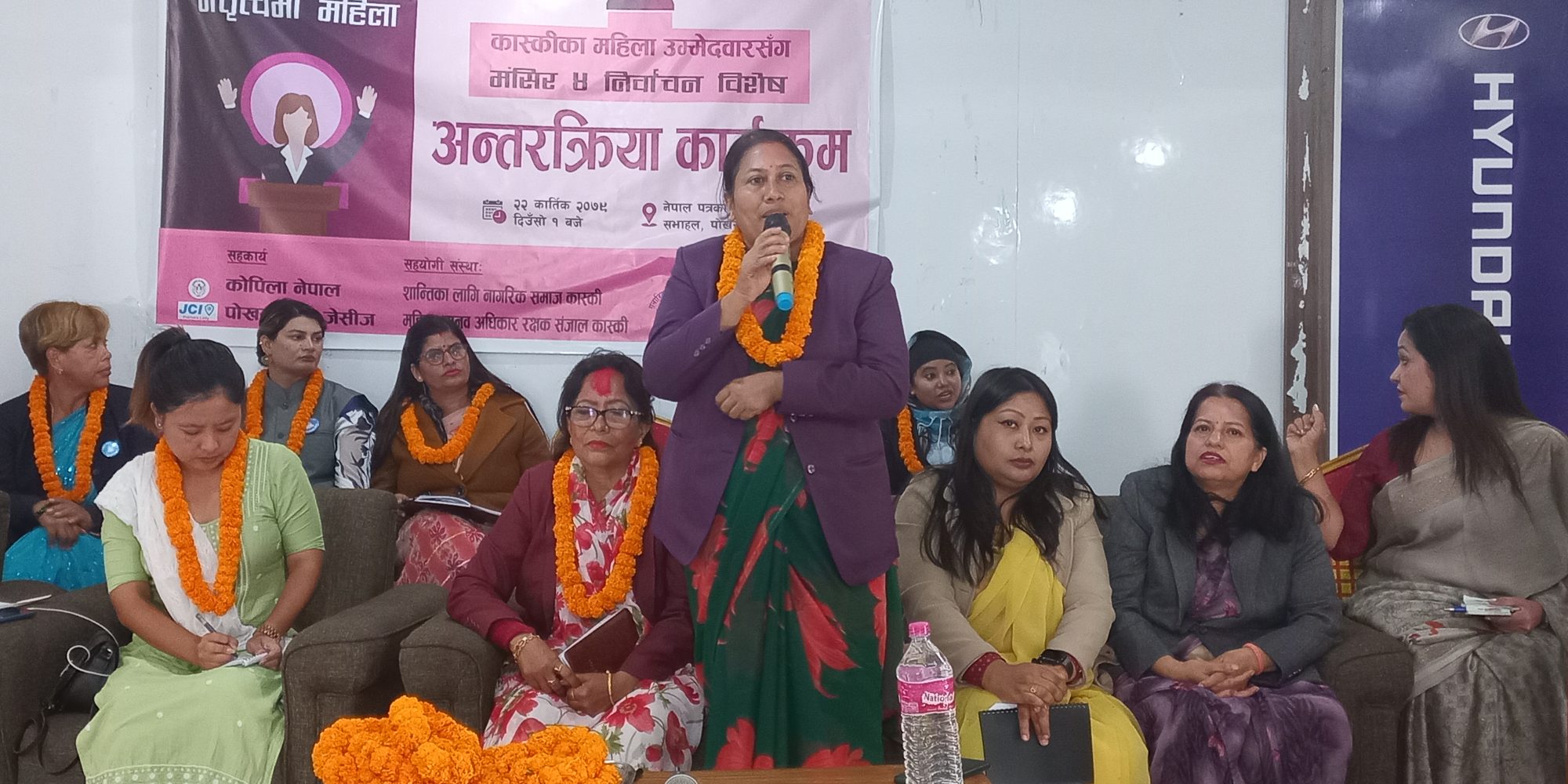 समुहकी प्रदेश अध्यक्ष कविता श्रेष्ठको अध्यक्षतामा भएको कार्यक्रममा नेपाली कांग्रेस प्रदेशका समानुपातिक उम्मेदवार लक्ष्मी पाण्डे, समानुपातिक उम्मेदवार जैनुम खातुङ, राष्ट्रिय स्वतन्त्र पार्टीका उम्मेदवार कृष्ण गुरुङ, राममाया बस्ताकोटि लगायतका महिला उम्मेदवारहरुले महिला नेतृत्व निर्माणसंगै पार्टीमा हस्तक्षपकारी भूमिका निर्वाह गर्नुपर्ने आवश्यकता औल्याएका थिए ।