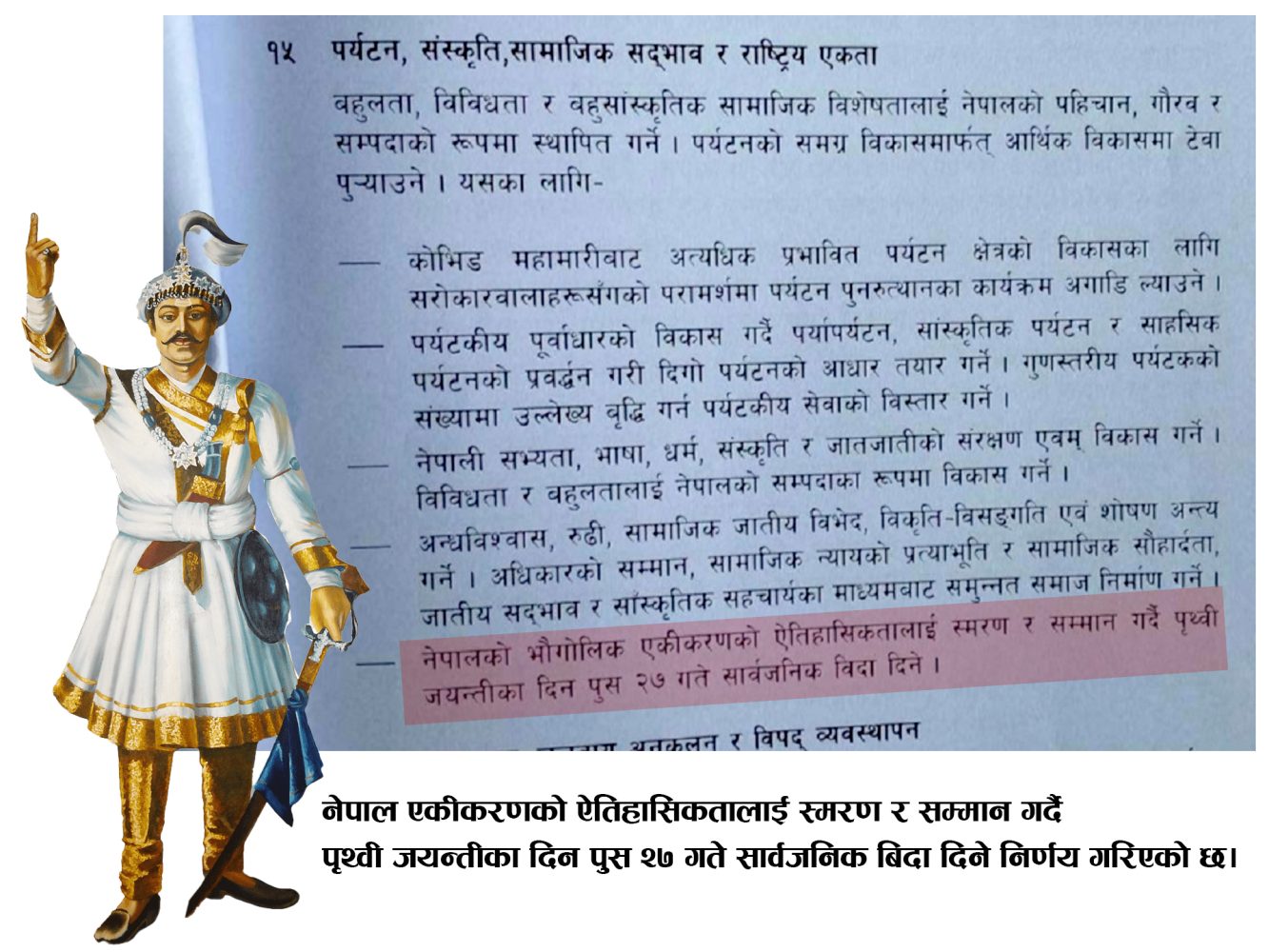 कार्यदलले तयार पारेको सरकारको न्यूनतम साझा कार्यक्रमको मस्यौदामा भनिएको छ, ‘नेपालको भौगोलिक एकीकरणको ऐतिहासिकतालाई स्मरण र सम्मान गर्दै पृथ्वी जयन्तीका दिन पुस २७ गते सार्वजनिक विदा दिने ।’
