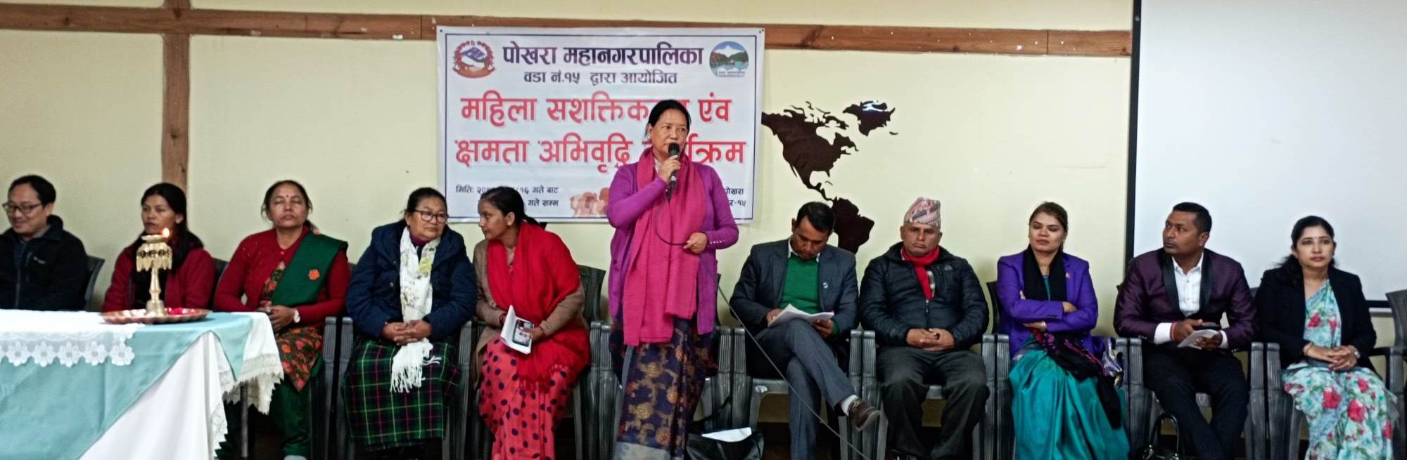 पोखरा महानगरपालिका वडा नम्वर १५ ले आज सोमबार आयोजना गरेको महिलाको सशक्तिकरण एवं क्षमता अभिबृद्धि कार्यक्रमको उद्घाटन गदै महानगरभित्र भौतिक पूर्वाधारसंगै मानवीय र सामाजिक विकास हुनुपर्नेमा जोड दिनुभयो । “सडक, पुल, भवन निर्माण मात्रै हैन महिला, ज्येष्ठ नागरिक, बालबालिका लगायत सामाजिक क्षेत्रको विकास पनि अनिवार्य छ ।”