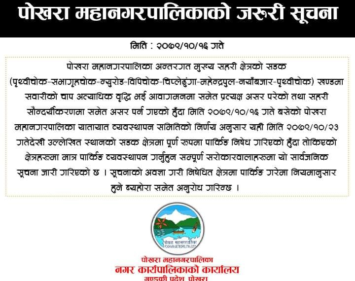 पोखराको पृथ्वीचोक, सभागृहचोक, न्यूरोड, विपिचोक, चिप्लेढुंगा, महेन्द्रपुल र नयाँबजार खण्डका सडकमा पार्किङ नगर्न आग्रह गरेको छ ।