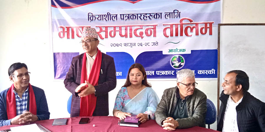 पोखरा । पोखराका क्रियाशील पत्रकारहरुका लागि आयोजित तीन दिने भाषा सम्पादन तालिम आइतबार सकिएको छ । पोखरा महानगरपालिकाको सहयोगमा नेपाल पत्रकार महासंघ कास्कीले तालिम आयोजना गरेको हो ।