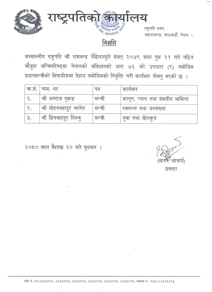 मोहनबहादुर बस्नेत स्वास्थ्य तथा जनसङ्ख्या र डिगबहादुर लिम्बु युवा तथा खेलकुद मन्त्री नियुक्त हुनुभएको राष्ट्रपति कार्यालयका प्रवक्ता सागर आचार्यले विज्ञप्ति मार्फत जानकारी दिनुभयो ।