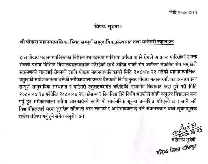 महानगरले जारी गरेको सूचनामा, पछिल्लो समय पोखरामा आखाँ पाक्ने रोगले आक्रान्त पारिरहेको र उक्त रोगको प्रभाव विद्यालयहरुमा समेत देखा परेको हुदाँ यसलाई रोक्न हिजो सोमबार महानरपालिकाका प्रमुखको संयोजकत्वमा सरोकारवालाहरुसँग बैठक बसि श्रावण २४ देखि २६ गतेसम्म तीन दिनका लागि महानगरपालिका अन्तर्गतका सम्पूर्ण सामुदायिक, संस्थागत र मन्टेश्वरि स्कुलहरु विदा दिने निर्णय भएको उल्लेख गरिएको छ ।