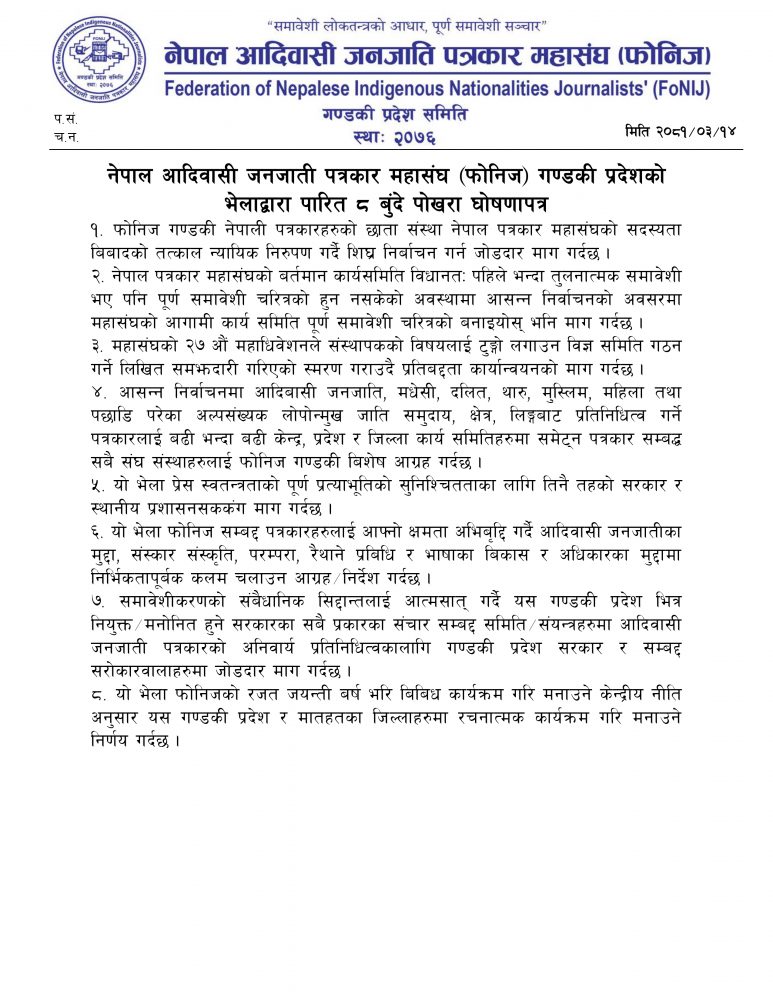 पोखरा १४, असार । नेपाल आदिवासी जनजाति पत्रकार महासंघ फोनिज गण्डकीले भेलाले ८ बुंदे पोखरा घोषणापत्र जारी गरेको छ ।
