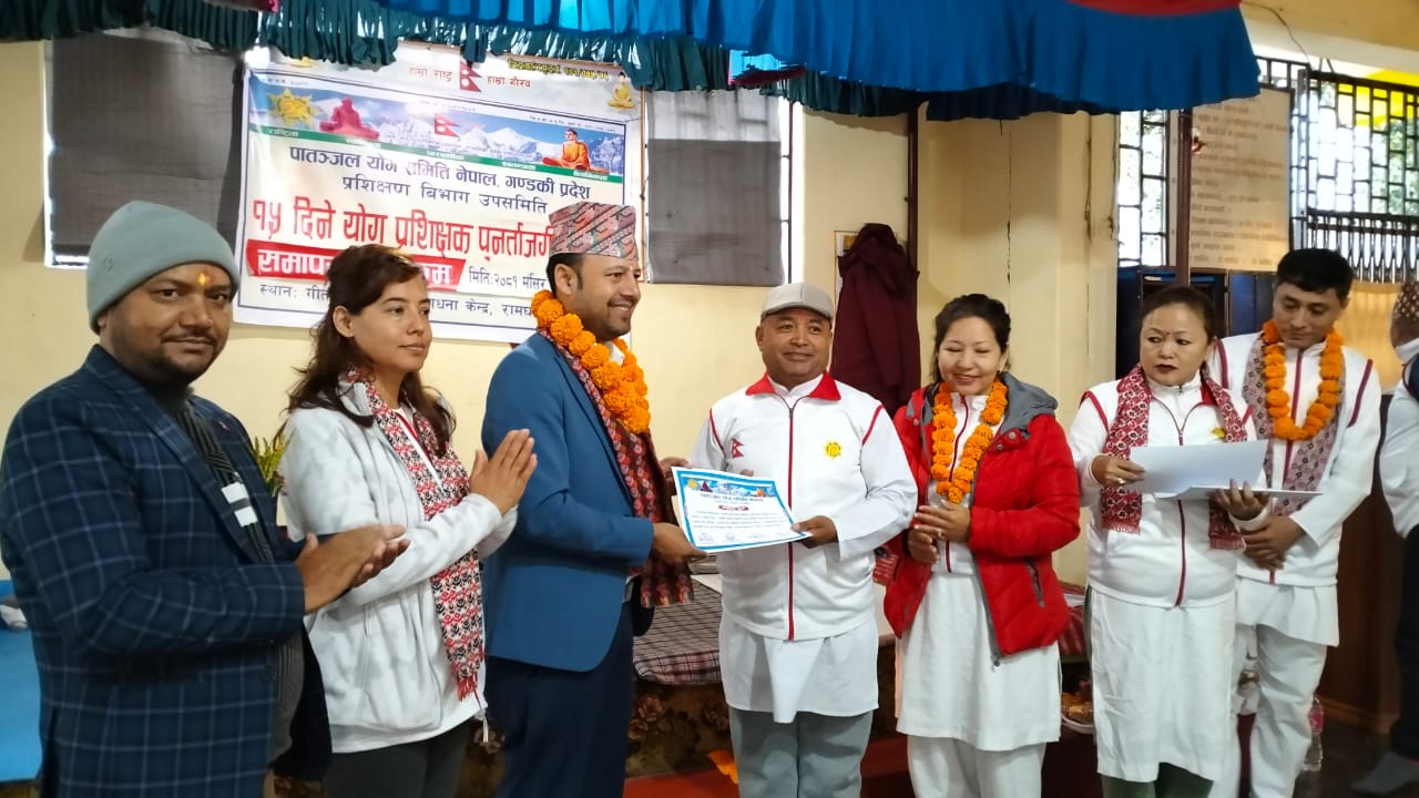 पोखरा । पातञ्जल योग समिति नेपाल, गण्डकी प्रदेश प्रशिक्षण विभाग उपसमितिको आयोजनामा १५ दिने योग प्रशिक्षक पुर्नताजगी कार्यक्रम समापन भएको छ ।