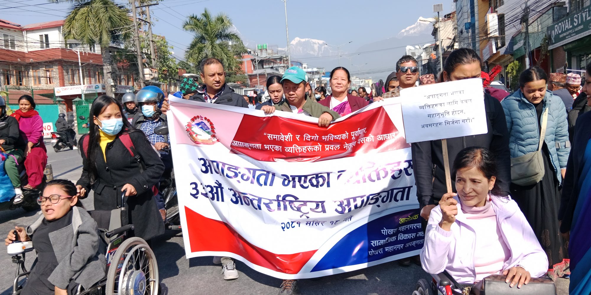दिवसको अवसरमा पोखराको चिप्लेढुुंङ्गाको मानव अधिकारचोकाबाट सुुरु भएको ¥याली न्यूरोड हुदैँ सभागृहमा पुुगेर कार्यक्रममा परिणत भएको थियो । ¥यालीमा पोखरामा अपांगताको क्षेत्रमा काम गर्ने संघसंस्थाका प्रतिनिधि र अपांगता भएका व्यक्तिहरुको सहभागिता थियो ।