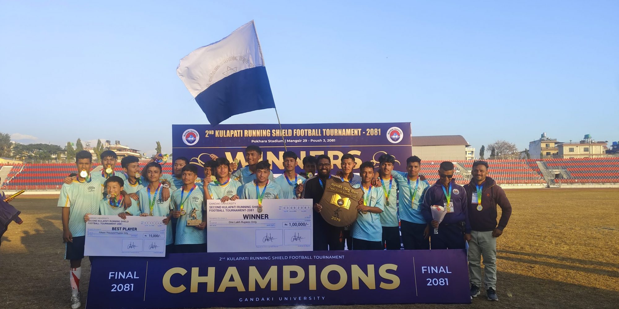 पोखरा । गण्डकी विश्वविद्यालयको आयोजनामा भएको दोस्रो कुलपति रनिङशिल्ड फुटबल प्रतियोगिताको उपाधि शहिद स्मृति माध्यमिक विद्यालयले जितेको छ ।