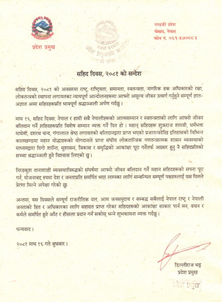 पोखरा । गण्डकी प्रदेशका प्रमुख डिल्लीराज भट्टले सहिद दिवसले देश र जनताप्रति समर्पित भएर लाग्नका लागि सम्पूर्ण पक्षहरुलाई प्रेरणा मिल्ने अपेक्षा गर्नुभएको छ ।