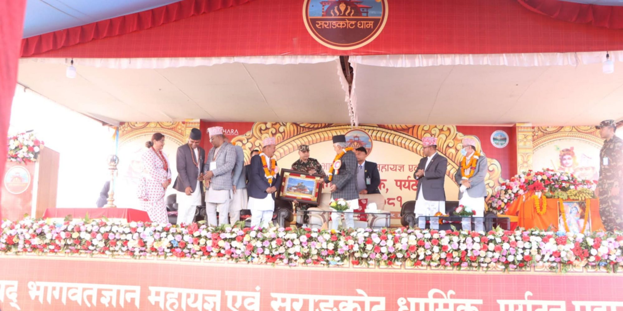 राष्ट्रपति पौडेलले सराङकोटको टपमा निर्माण भएका विशाल पञ्चमुखि गणेश मुर्ति, कैलाशेश्वर शिव मन्दिर, १०८ शिवलिङग तथा जलधारा, ऐतिहासिक भूमेकालिका तथा भैरव मन्दिर सहितका धार्मिक संरचना एवम् त्यहाँ जारी श्रीमद्भागवत् ज्ञानमहायज्ञ एवम् धार्मिक पर्यटन महाउत्सवको विधिपूर्वक पुजाअर्चना गरी उद्घाटन गर्नुभयो ।