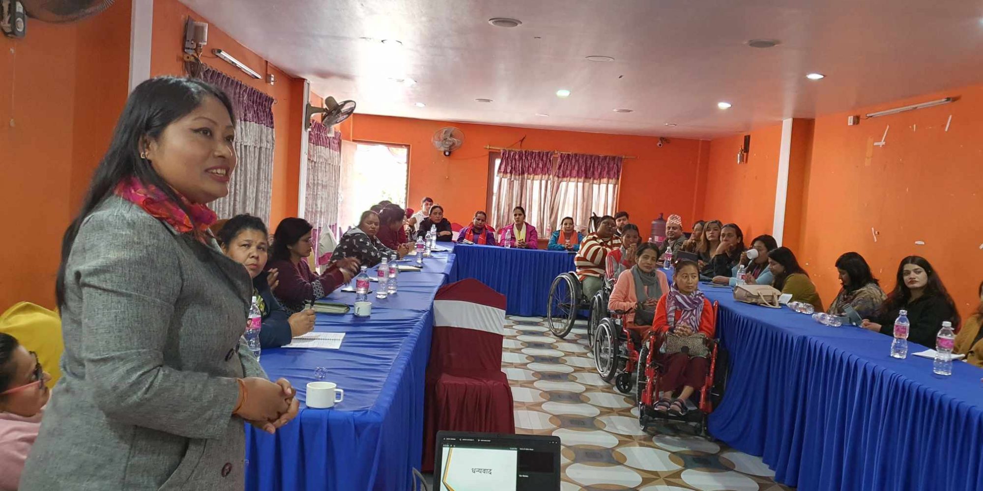 अपाङ्ग महिला सशक्तिकरण केन्द्र कास्कीका अध्यक्ष अञ्जना केसीले अपाङ्गताका अधिकार सुनिश्चितताका लागि विभिन्न राष्ट्रिय र अन्तराष्ट्रिय कानुनी प्रावधानको बारेमा जानकारी गराउँदै आफ्नो हकको लागि आफै अग्रसर हुनुपर्नेमा जोड दिनुभयो ।