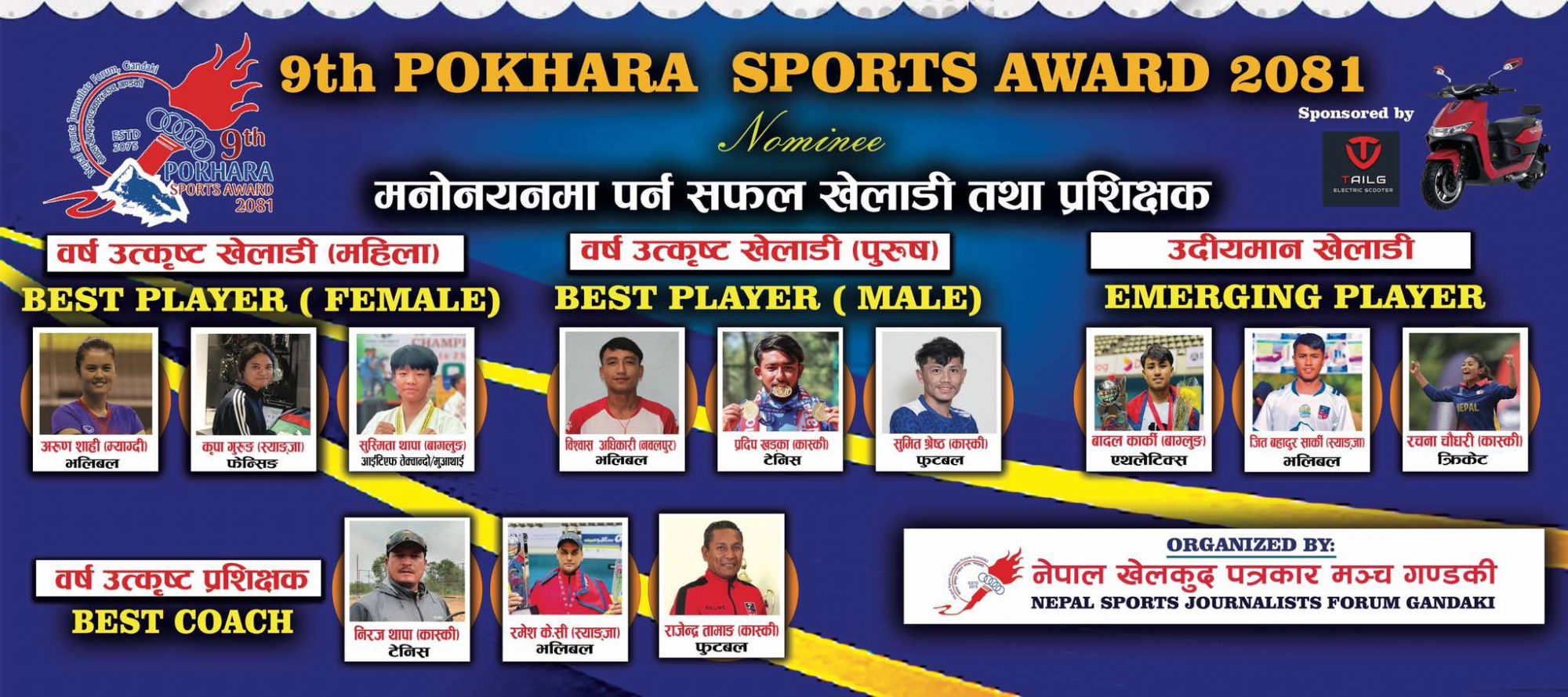 यसैगरी वर्ष उत्कृष्ट प्रशिक्षक विधामा टेनिसका निरज थापा (कास्की), भलिबलका रमेश केसी (स्याङ्जा) र फुटबलका राजेन्द्र तामाङ (कास्की) मनोनयनमा परेका छन् ।