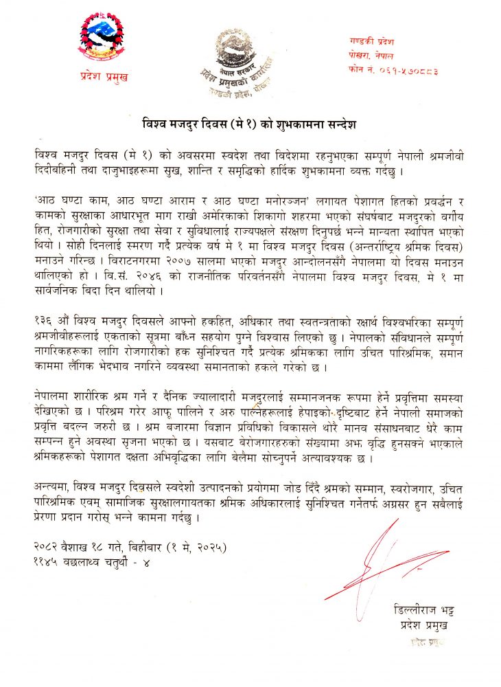 पोखरा, १८ वैशाख । गण्डकी प्रदेशका प्रमुख डिल्लीराज भट्टले विश्व मजदुर दिवस (मे १) को अवसरमा शुभकामना व्यक्त गर्नुभएको छ ।