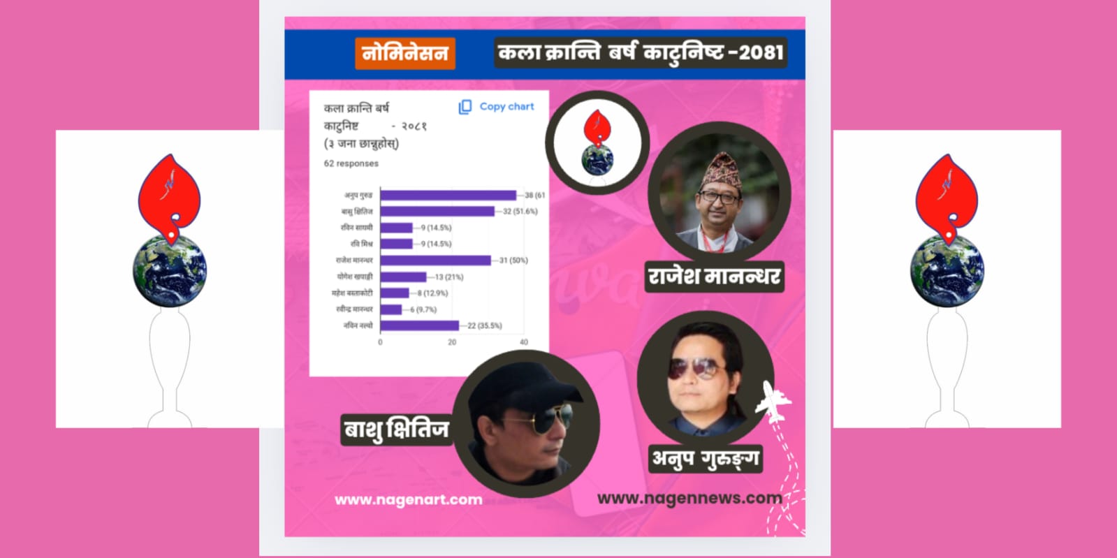 नेपाल र नेपालीको गौरब र श्रीवृद्धिको लागि २०८१ सालमा कार्टुन क्षेत्रमा सकरात्मक आशा जगाउने, रचनात्मक कार्यक्रम मार्फत आफ्नो सक्रिय भूमिका स्थापित गरेका ९ पात्रहरू बाट ‘गुगल फारम’ मा आएका मत विश्लेषणका आधारमा उत्कृष्ट ३ कला क्रान्ति बर्ष कार्टुनिष्टहरु बाशु क्षितिज, राजेश मानन्धर र अनुप गुरुङ भएका छन् ।