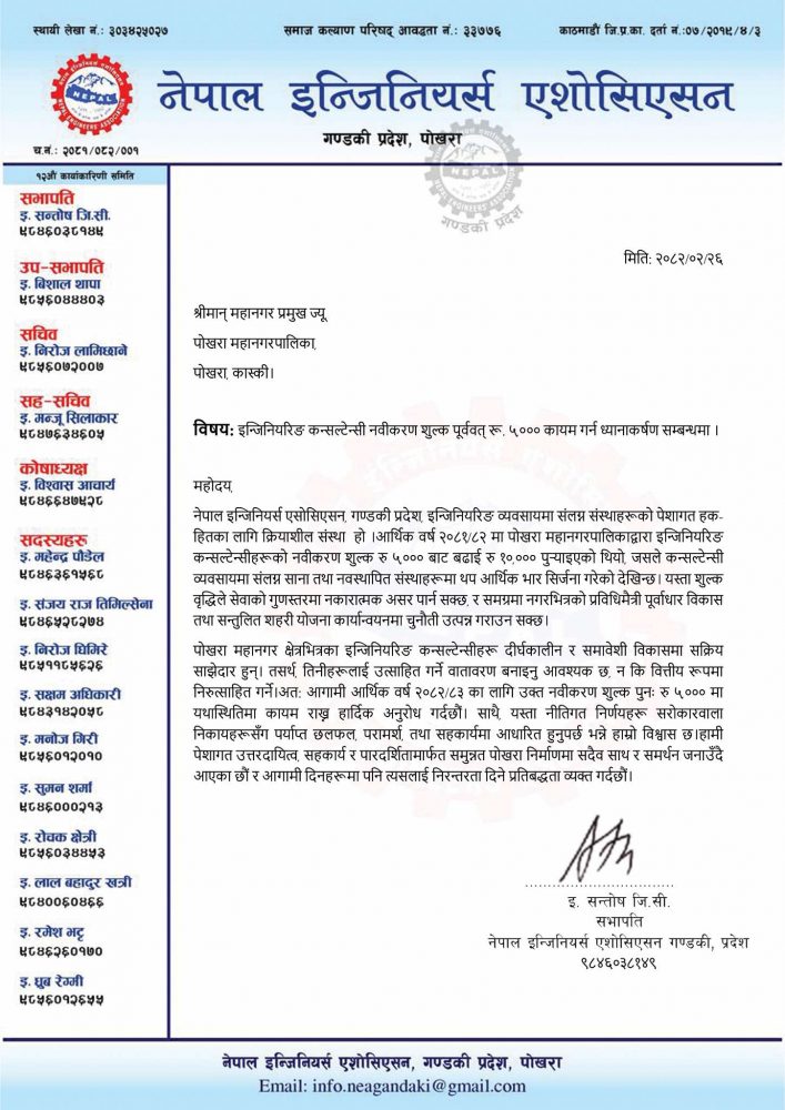 नेपाल इन्जिनियर्स एसोसिएसन गण्डकी प्रदेश कार्यसमिति तथा अन्य इन्जिनियरहरू संयुक्त रूपमा पोखरा महानगरपालिकाकी उपप्रमुख मञ्जु गुरुङसहित सम्बन्धित पदाधिकारीहरूसँग भेट गरी पोखरा महानगरपालिकाले इन्जिनियरिङ कन्सल्टेन्सी नवीकरण शुल्कमा गरेको एकपक्षीय वृद्धि विरुद्ध ध्यानाकर्षण गरेका हुन् ।