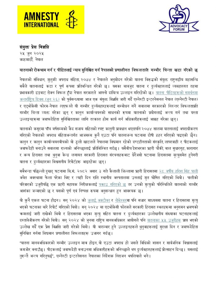 विहिबार “यातना विरुद्धको अन्तराष्ट्रिय दिवस”को अवसरमा दुवै संस्थाले संयुक्त रुपमा विज्ञप्ति जारी गर्दै सरकारको निरन्तर निष्क्रियता, जवाफदेहिताको अभाव र दण्डहीनताको संस्कृतिको आलोचना गरेको छ ।