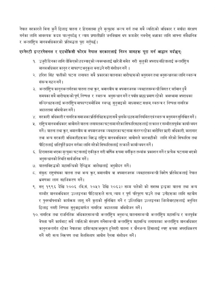 एम्नेस्टी इन्टरनेसनल र एड्भोकेसी फोरम नेपालद्धारा जारी १० बुँदे मागहरु