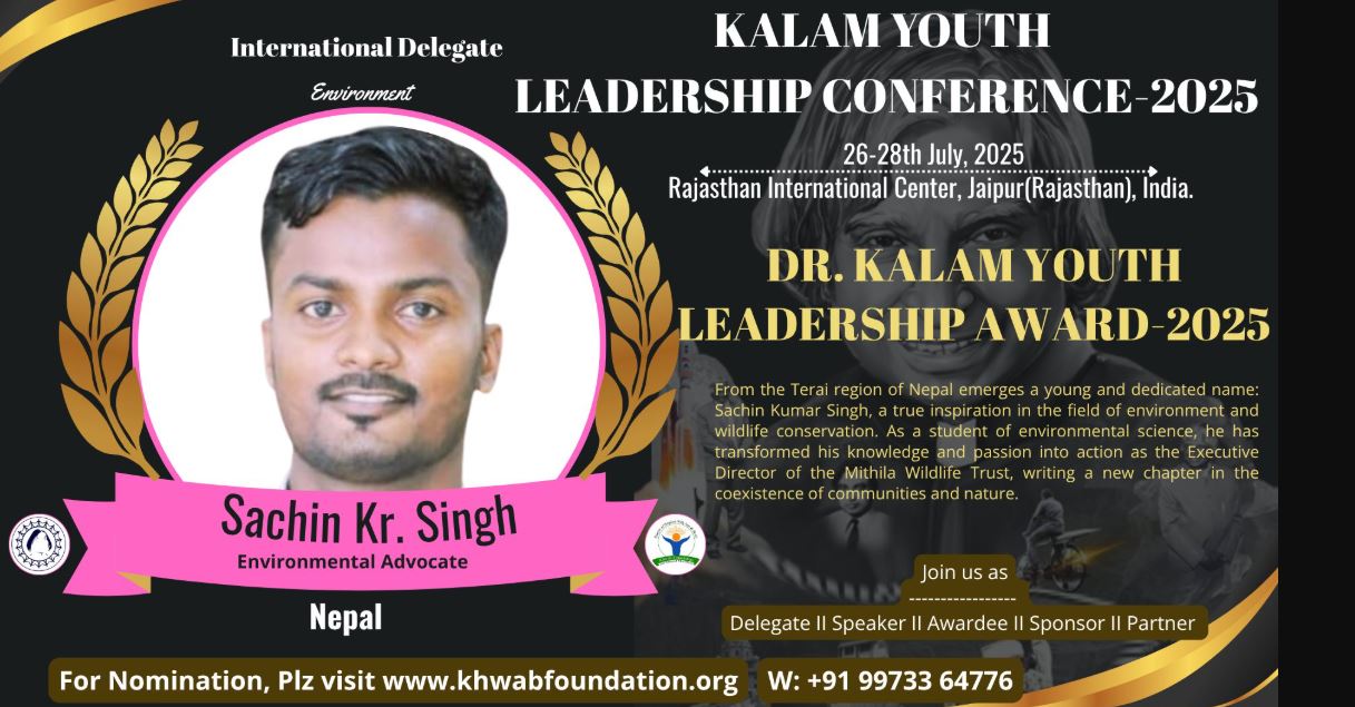 धनुषा । पर्यावरण तथा वन्यजन्तु संरक्षणको क्षेत्रमा उल्लेखनीय योगदान पुर्याउँदै आउनुभएको नेपालका सचिनकुमार सिंहलाई भारतको प्रतिष्ठित डा. कलाम युथ रत्न अवार्ड २०२५ प्रदान गरिने भएको छ ।