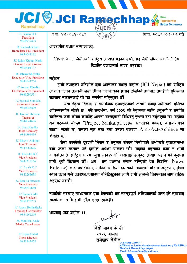 नेपाल जेसीज (JCI Nepal) का अनुभवी र समर्पित नेता जेसी जीवन कार्कीले वर्ष २०२६ का लागि राष्ट्रिय अध्यक्ष पदमा औपचारिक रूपमा उम्मेदवारी दर्ता गर्नुभएको छ ।